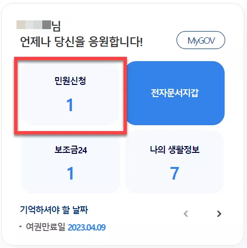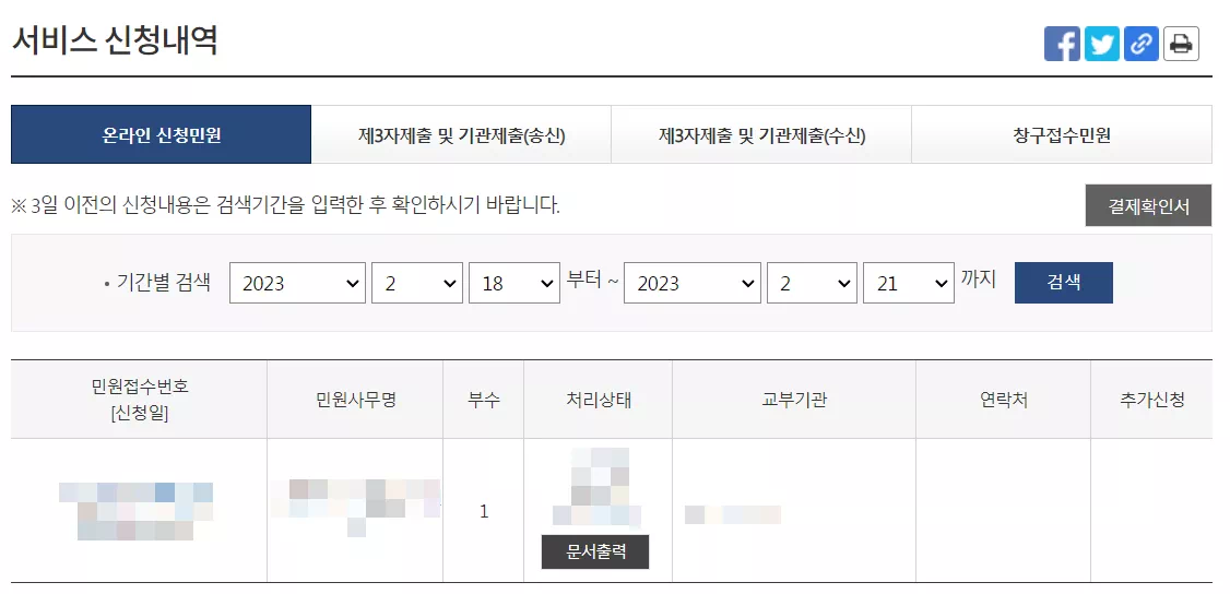 민원 접수가 완료되면 신청한 민원을 거버넌스24 첫 화면에서 검토할 수 있습니다. 이후 서비스 신청내역에서 문서 열람 및 출력이 가능합니다.
