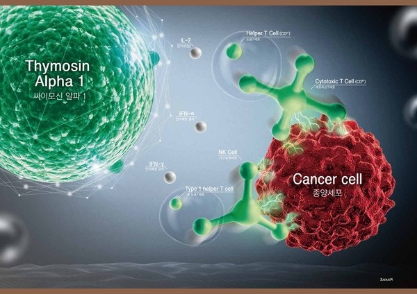 사이모신 알파1은 항암면역요법으로 먼저 알려져 있지만 바이러스나 암세포 표면에 존재하는 표적물질인 MHC Class I의 발현을 증가시켜 신속한 파괴를 돕고 강력한 면역세포 활성화로 면역세포(NK cell, Th cell, CTL 등)의 활성을 증가시켜 암세포의 성장 및 전이를 억제하는 역할을 하는 것으로 알려져 있습니다.