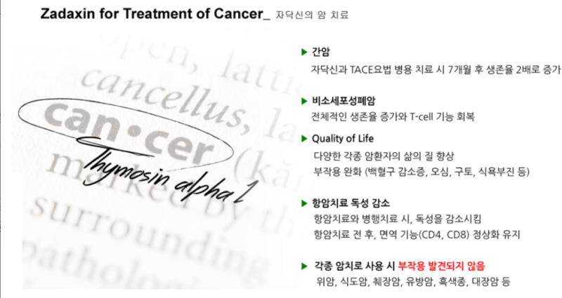 사이모신 알파1의 항암보조치료 효과에 대한 논문도 많이 발표되었는데 대표적으로 비소세포폐암, 간암, 유방암 환자에서 항암치료 부작용 감소와 환자의 삶의 질을 향상시키고 생존율을 증가시킨 것으로 보고되고 있습니다.
