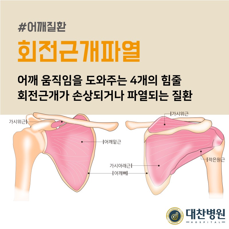 견관절은 다른 관절에 비해 가동 범위가 넓지만 상대적으로 안정성은 떨어집니다. 이 안정성 및 가동성을 유지하기 위해 견관절 주변 근육 및 인대 등이 중요한 역할을 하며 손상도 자주 나타납니다.대표적으로 회전근개라고 불리는 극상근, 극하근, 소원근, 견갑하근이 있는 것과 관련된 질환으로 어깨회전근개파열과 어깨충돌증후군이 있습니다.어깨 둘레 근개 파열은 젊은 층의 경우 스포츠 활동, 외상 등으로 인해 50대 이후에는 퇴행성 변화로 많이 발생합니다. 주요 어깨 둘레 근개 파열 증상