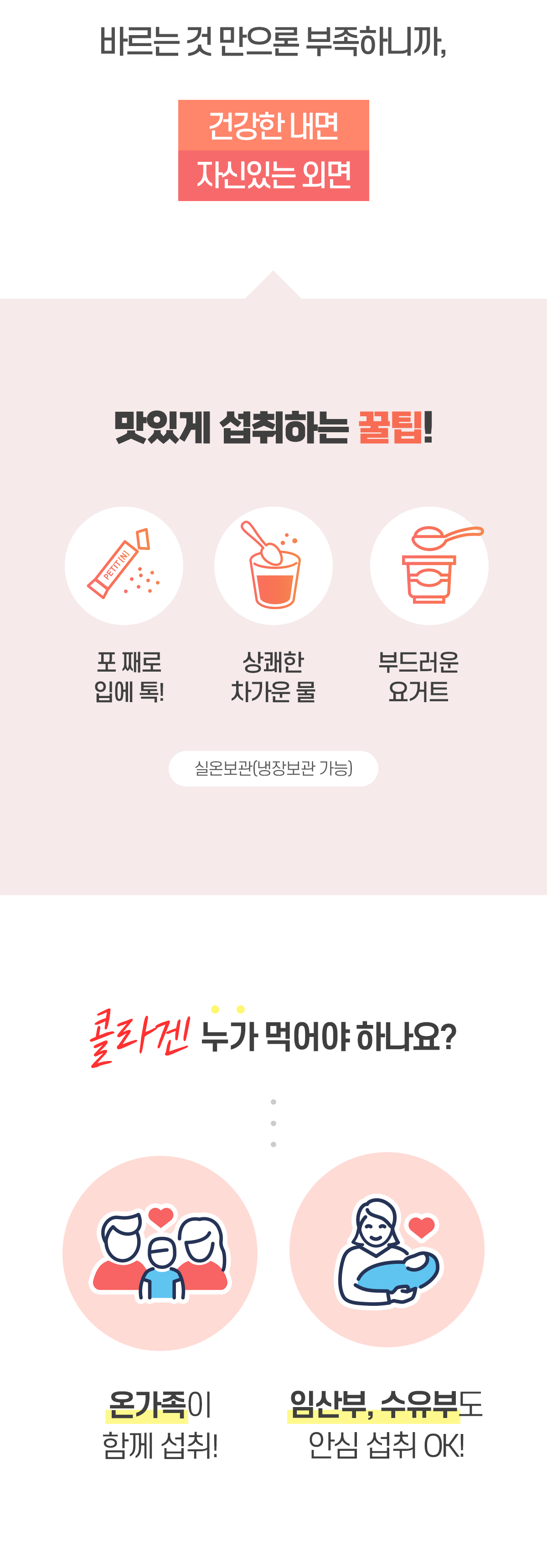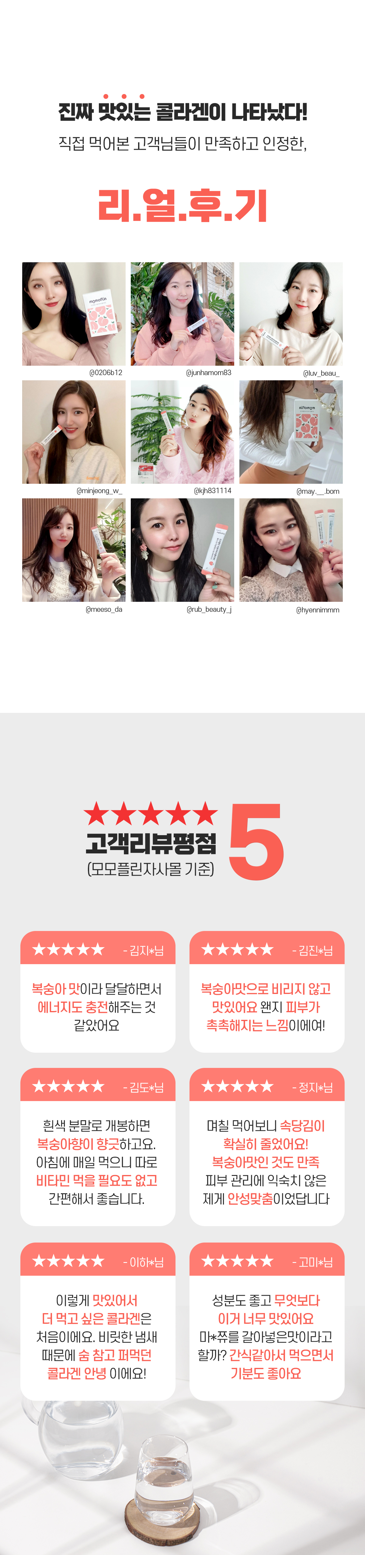 체내 흡수율을 높일 수 있는 복숭아맛 저분자량 콜라겐 파우더가 맛있고 만족스러운 부위입니다.