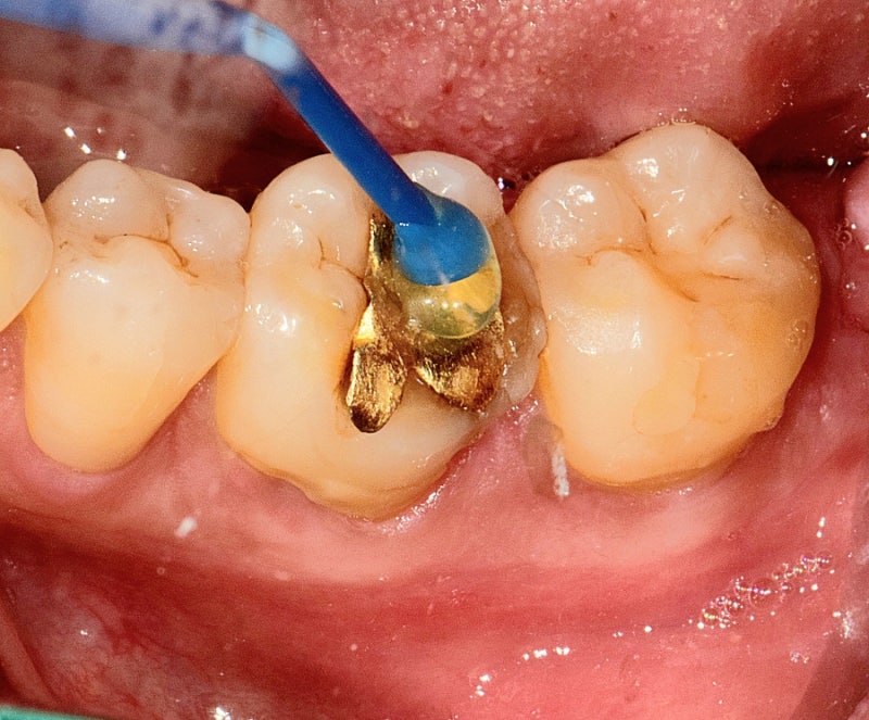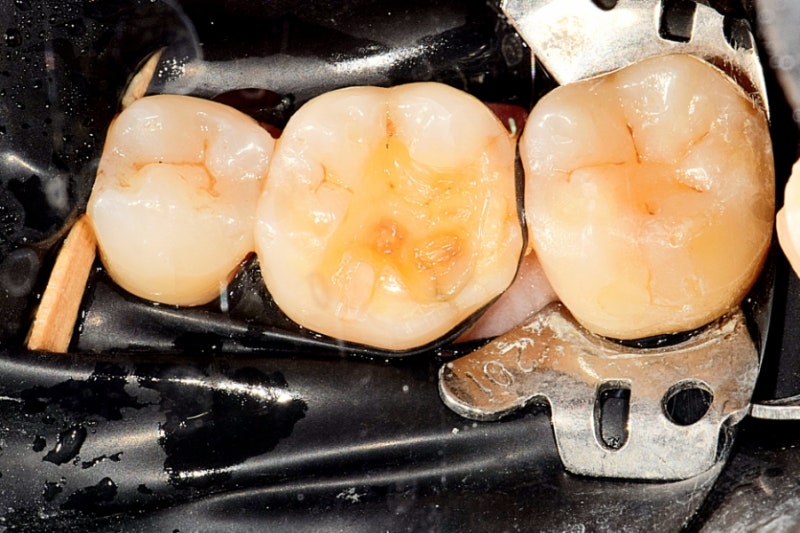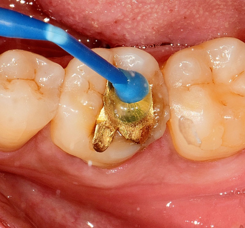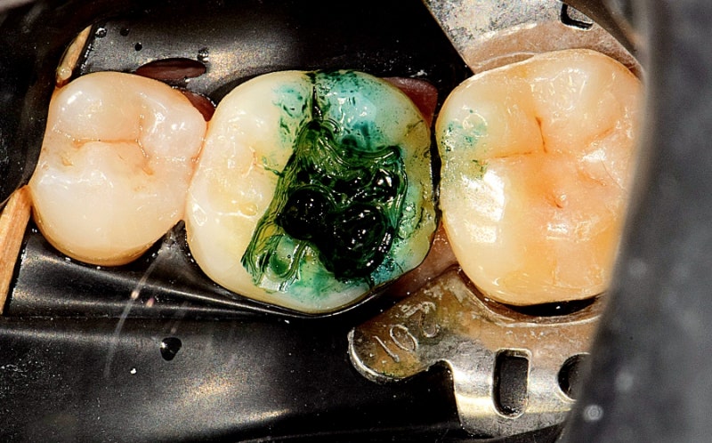 썩은 부분을 녹색으로 바꾸는 세이블 탐색. 이것은 값 비싼 시약입니다. 작은 치아라도 보존하기 어려울 수 있습니다.