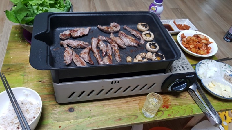 캠핑장에서는 남편이 셰프! 고베 캠프의 가스 버너 그릴 철판이 있기 때문에 남편도 편하게 장어구이를 구울 수 있어서 설렜습니다.