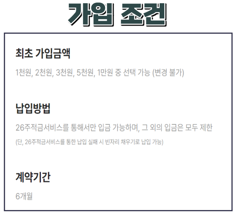 주당 최대상환액을 1만원으로 설정한 경우 추정원금은 351만원, 연이율 7% 적용시 예상이자는 세전 43,304원입니다. 또한 상품은 긴급출금 서비스 지원 및 무료적립 기능을 갖추고 있어 사용이 간편하다. 초기 약정금리는 상대적으로 높으나 실제로는 입금액에 대한 금리적용방식에 의해 발생합니다. 월 납입금액이 크면 카카오뱅크 무료예금이나 타은행 정기예금을 이용하는 것이 유리하다. (자유적립형) 최초 가입금액 : 1,000원, 2,000원, 3,000원, 5,000원, 10,000원 ​​선택 가능 (변경 불가) 결제방법 : 26주 적금으로만 입금 가능, 타 입금은 제한됨 -(단, 26주 적금 미납시 빈칸을 채워서 납부) 약정기간 : 6개월 이자지급방식 : 만기일시납부 이자계산방식 : 이자계산 예치기간 내 예치금별 약정금리에 따라 세제혜택 : 비과세 통합예금으로 이용 가능 보호 : 최대 5천만원 OK