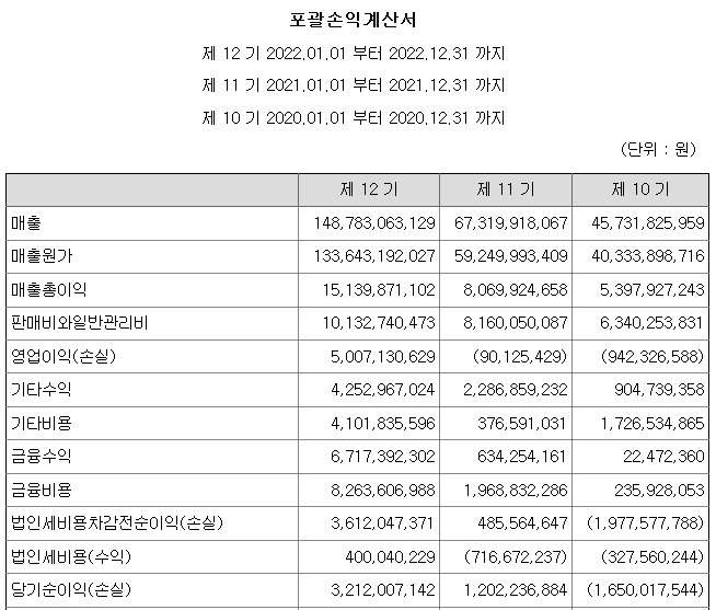 2022년 매출 1487억원, 영업이익 50억원, 당기순이익 32억원을 달성하며 흑자 전환했다.
